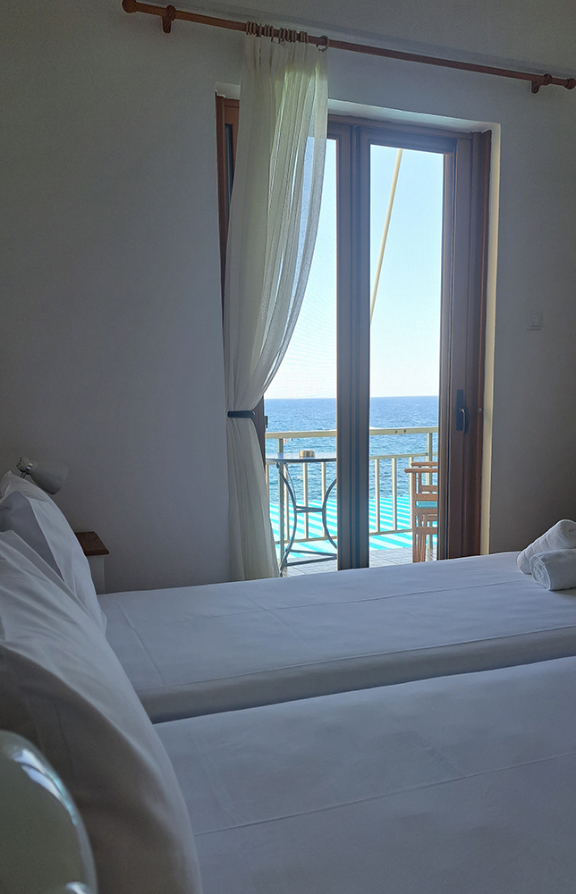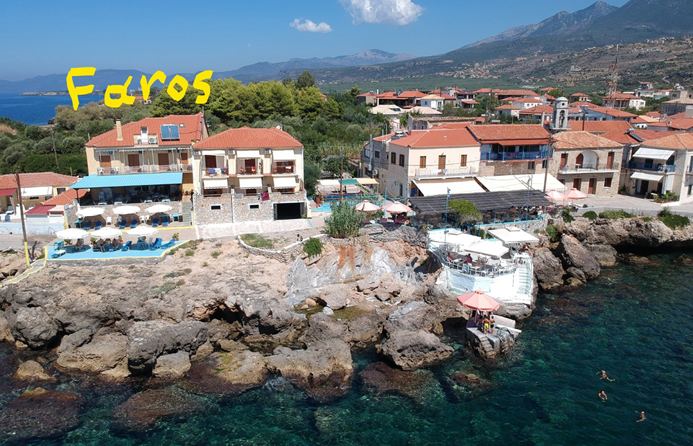 Τα δωμάτια του FAROS βρίσκονται στον 1ο όροφο του κτιρίου, πρόσβαση με σκάλα. Όλα τα δωμάτια έχουν μπαλκόνι, είναι ψηλοτάβανα , ευάερα και πολύ φωτεινά. Οι μπαλκονόπορτες έχουν παντζούρια αλουμίνια, σίτες και διπλά τζάμια. Τα δωμάτια με μπαλκόνι με θέα απευθείας θάλασσα βλέπουν την ανατολή του Ηλίου και νότο μέχρι το ακρωτήρι Ταίναρο. Τα δωμάτια με μπαλκόνι με μερική θέα στη θάλασσα και χωριό, βλέπουν το ηλιοβασίλεμα. Όλα τα δωμάτια προσφέρουν λειτουργικότητα, χρησιμότητα και απλότητα σε ένα ήρεμο παραθαλάσσιο περιβάλλον.