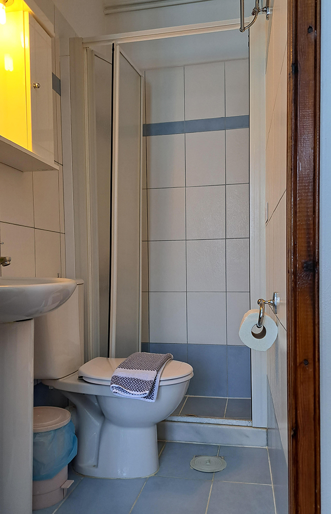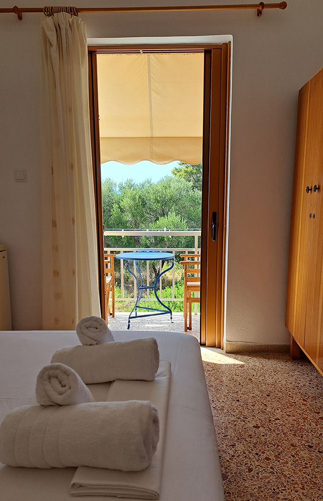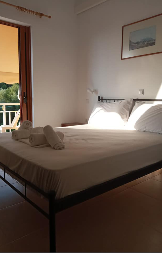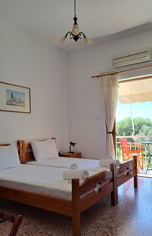 Διαθέτουμε δίκλινα δωμάτια με ιδιωτικό μπάνιο, εξοπλισμένα με διπλό κρεβάτι ή δύο μονά κρεβάτια, ιδανικά για ζευγάρια και σόλο ταξιδιώτες. Επίσης διαθέτουμε δίχωρο οικογενειακό δωμάτιο με ιδιωτικό μπάνιο, ιδανικό για οικογένειες και παρέες.